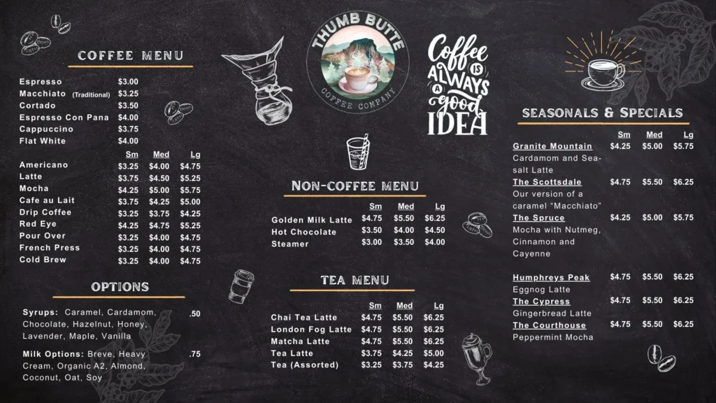 Café Americano: Sm $3.25 / Md $4.00 / Lg $4.75